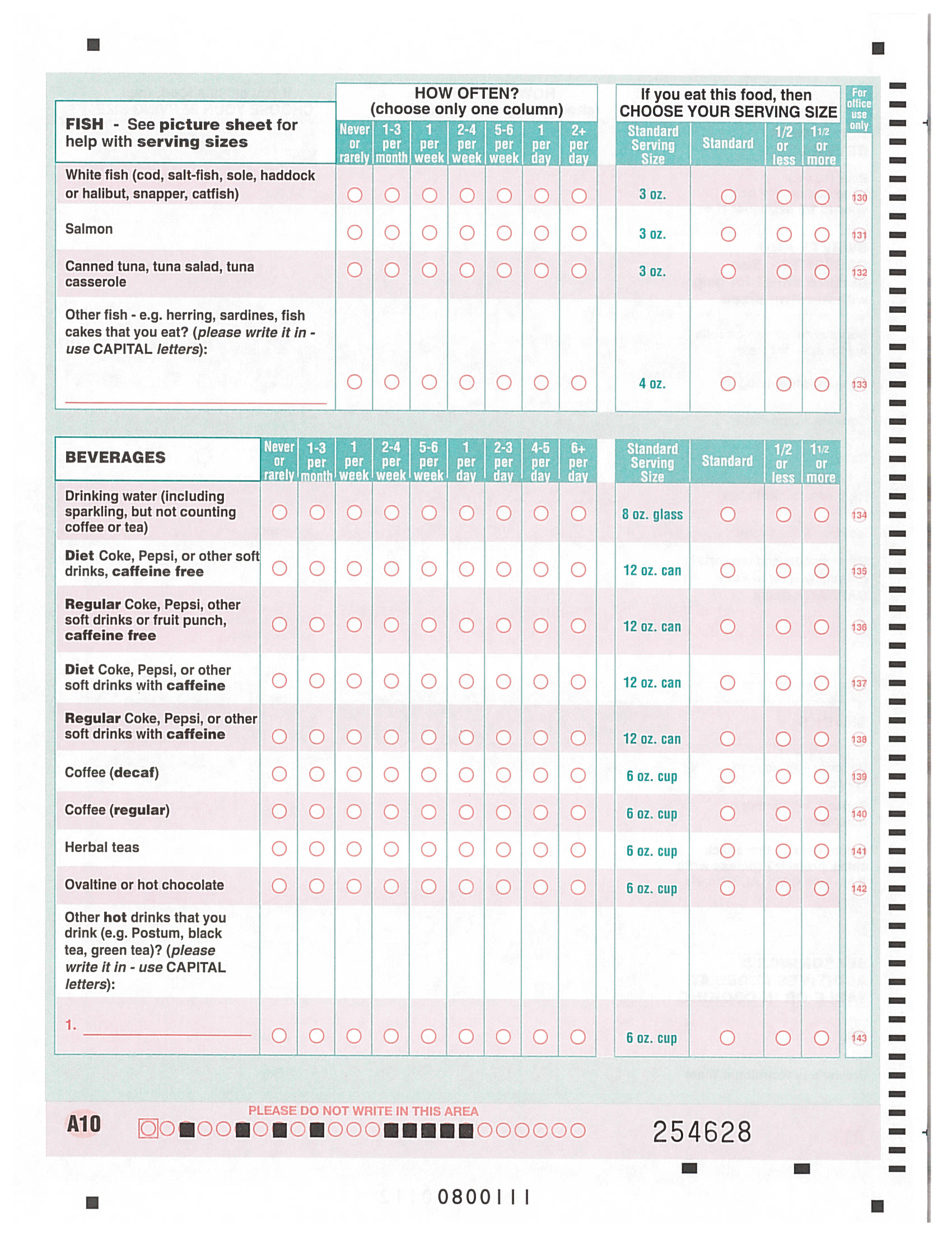* This page contains food frequency questions about fish and beverages.