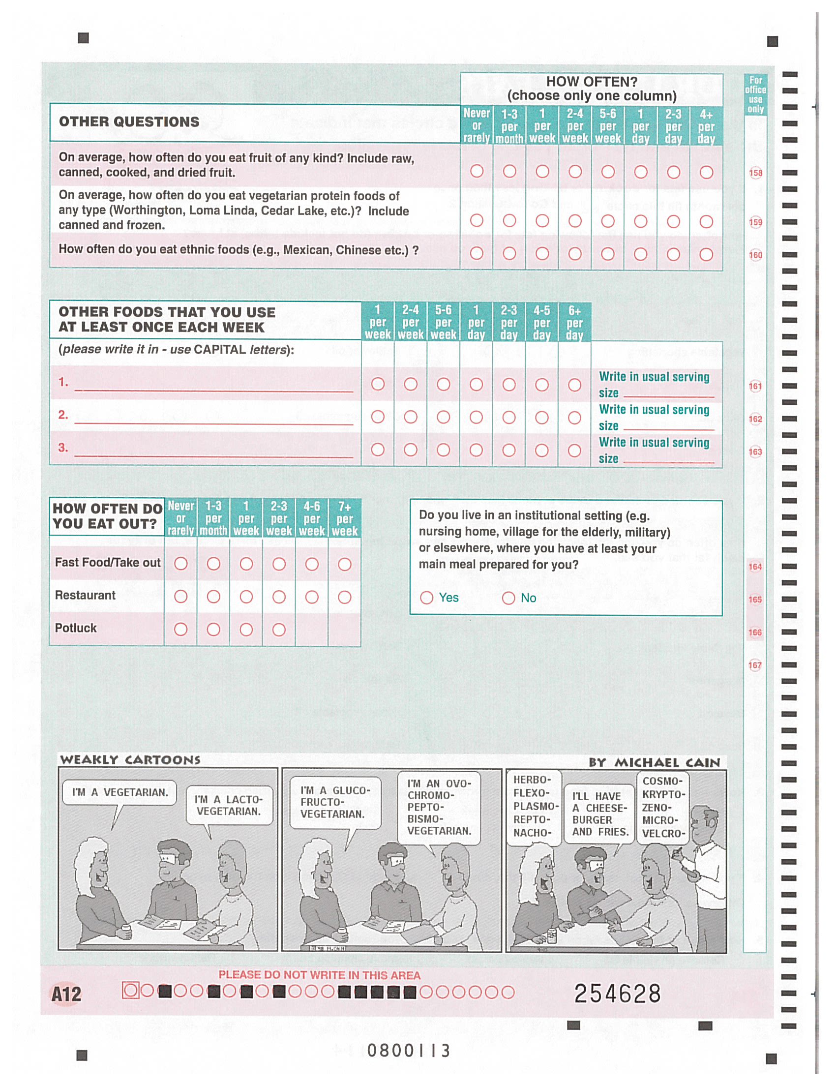 * This page contains questions about food frequency, meal preparation, and weight change.