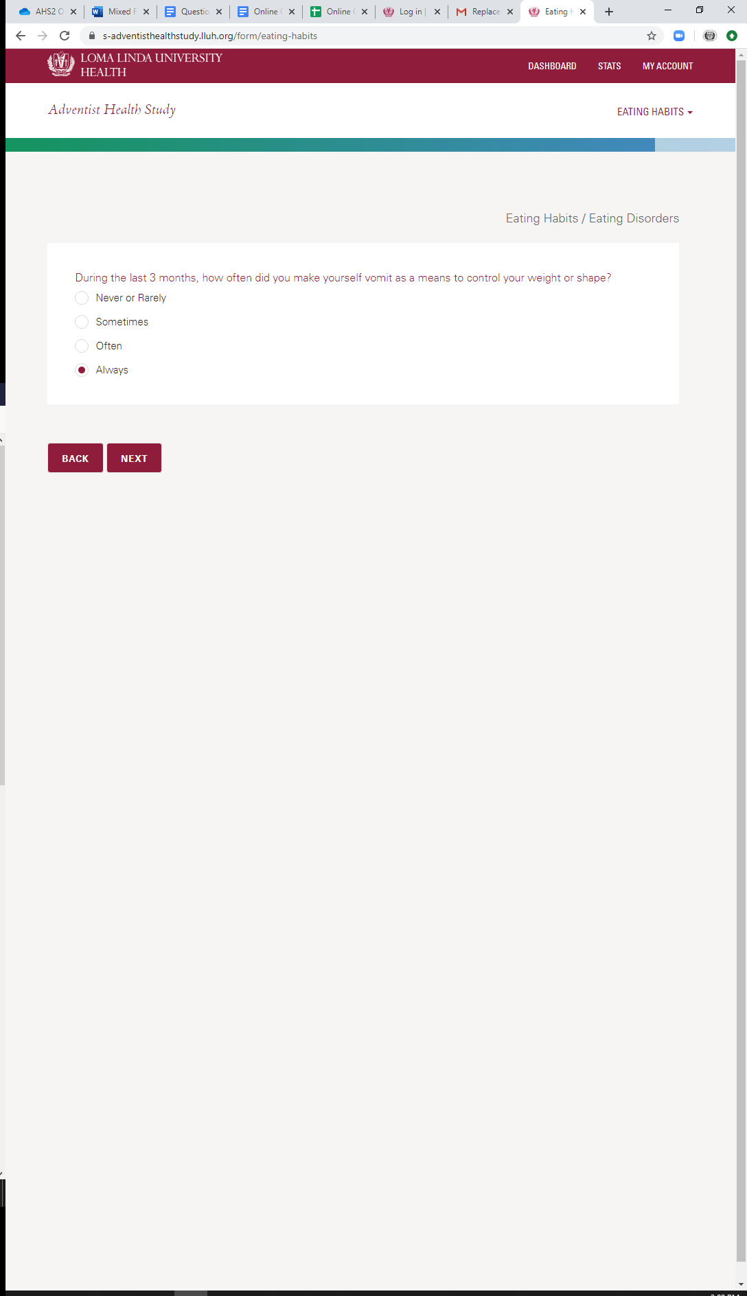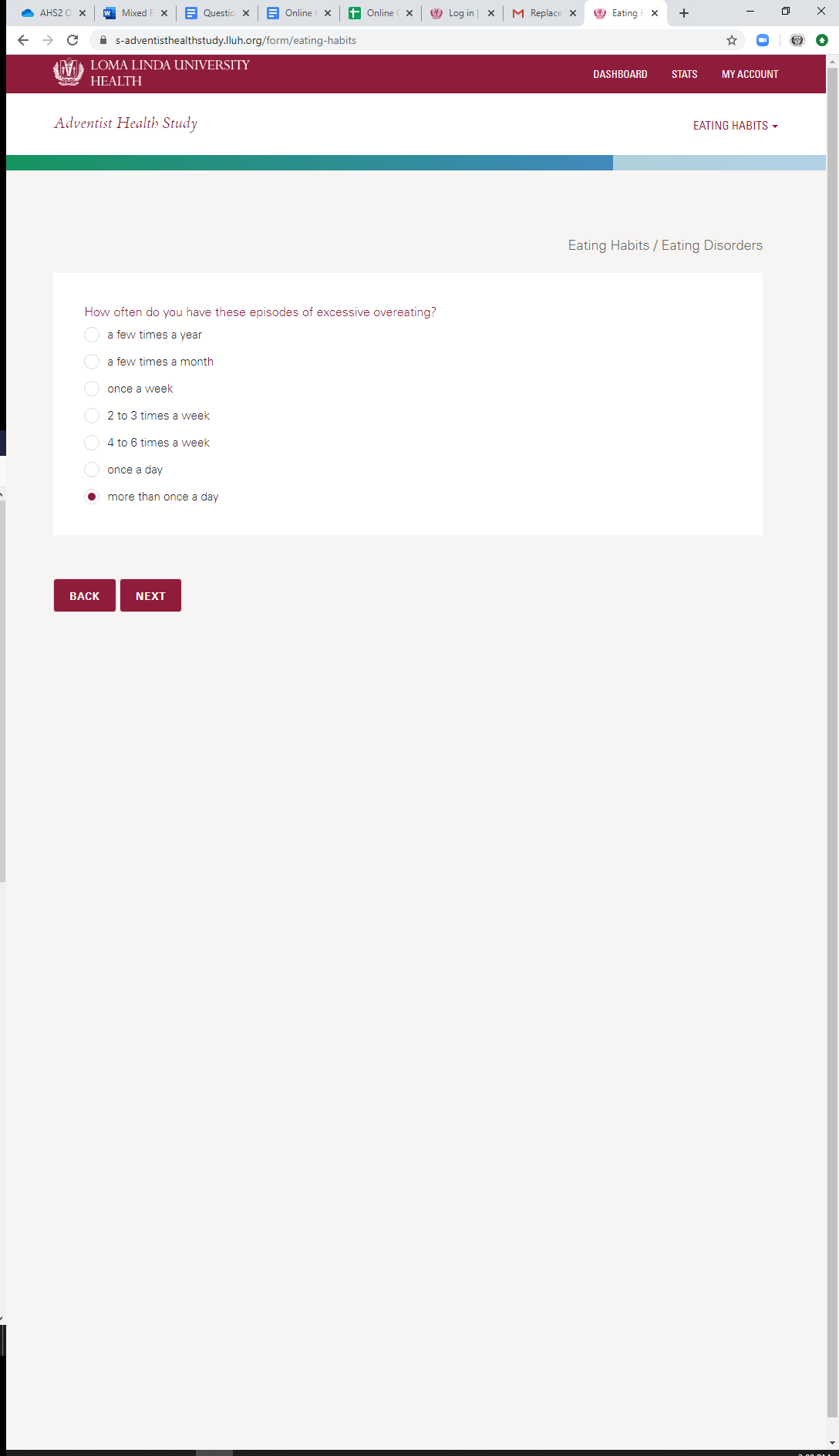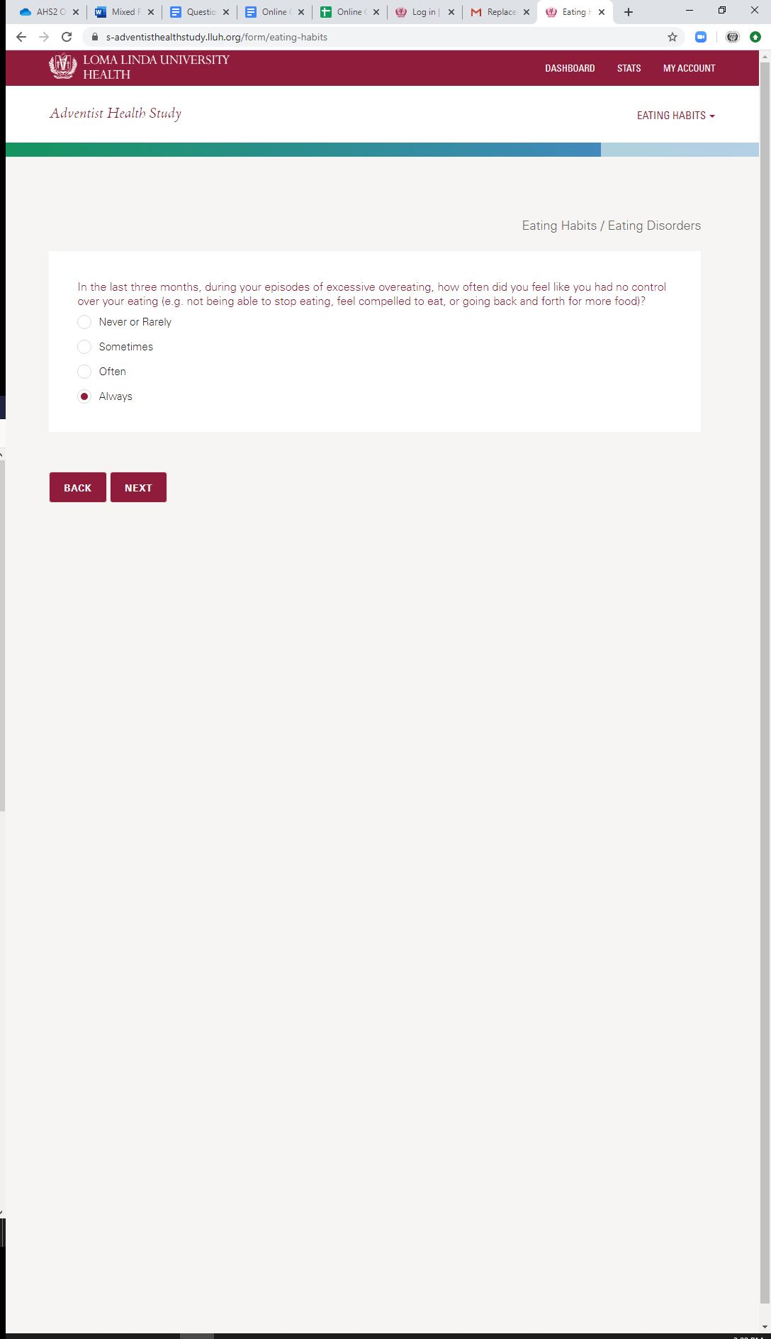 * IN THE LAST THREE MONTHS, DURING YOUR EPISODES OF EXCESSIVE OVEREATING, HOW OFTEN DID YOU FEEL LIKE YOU HAD NO CONTROL OVER YOUR EATING (E.G. NOT BEING ABLE TO STOP EATING, FEEL COMPELLED TO EAT, OR GOING BACK AND FORTH FOR MORE FOOD)?