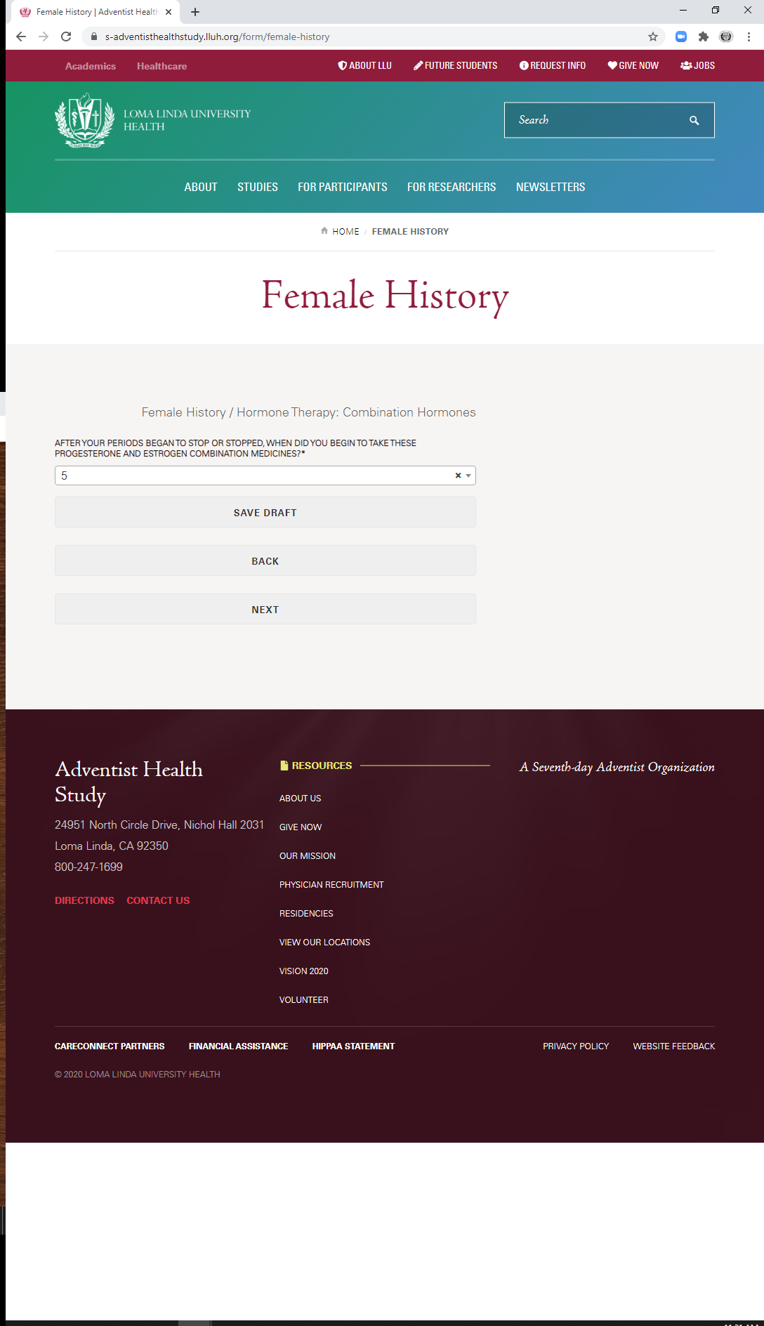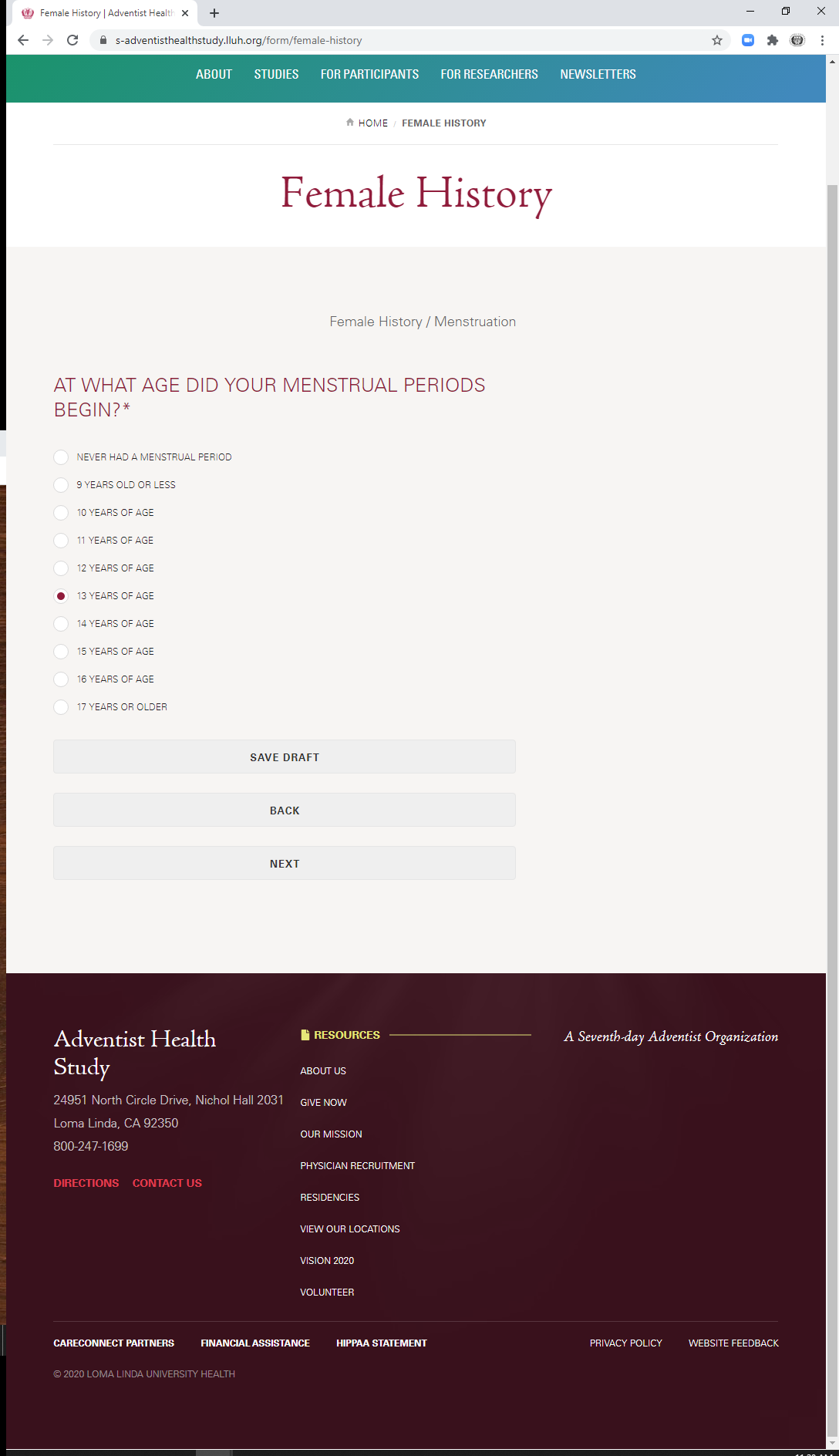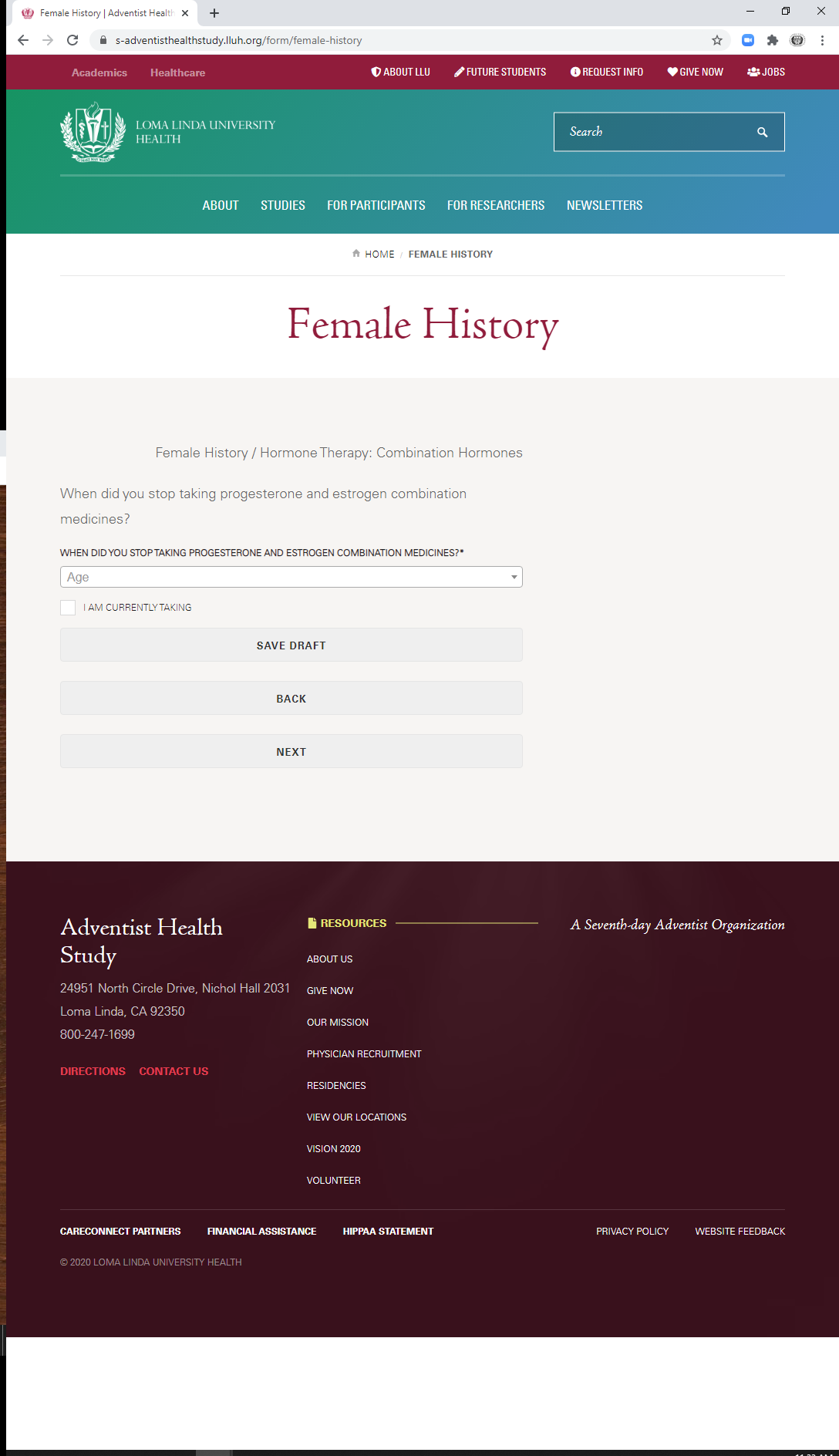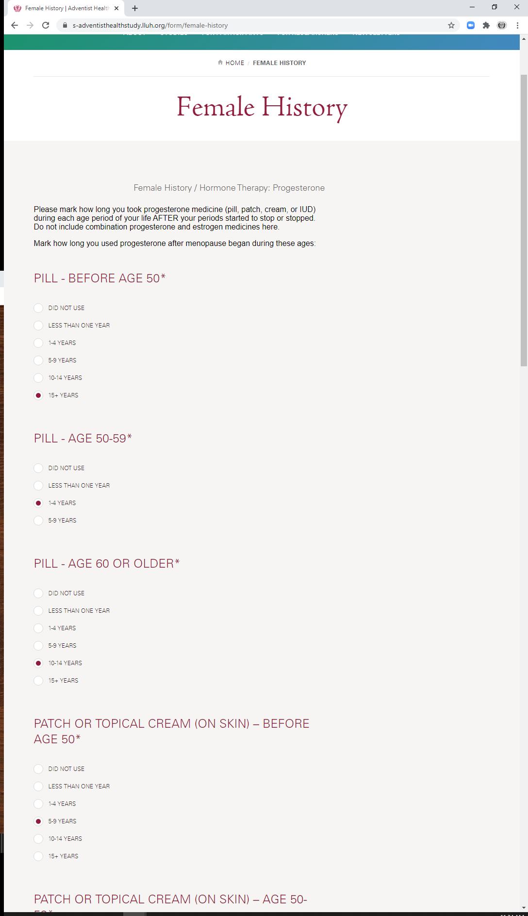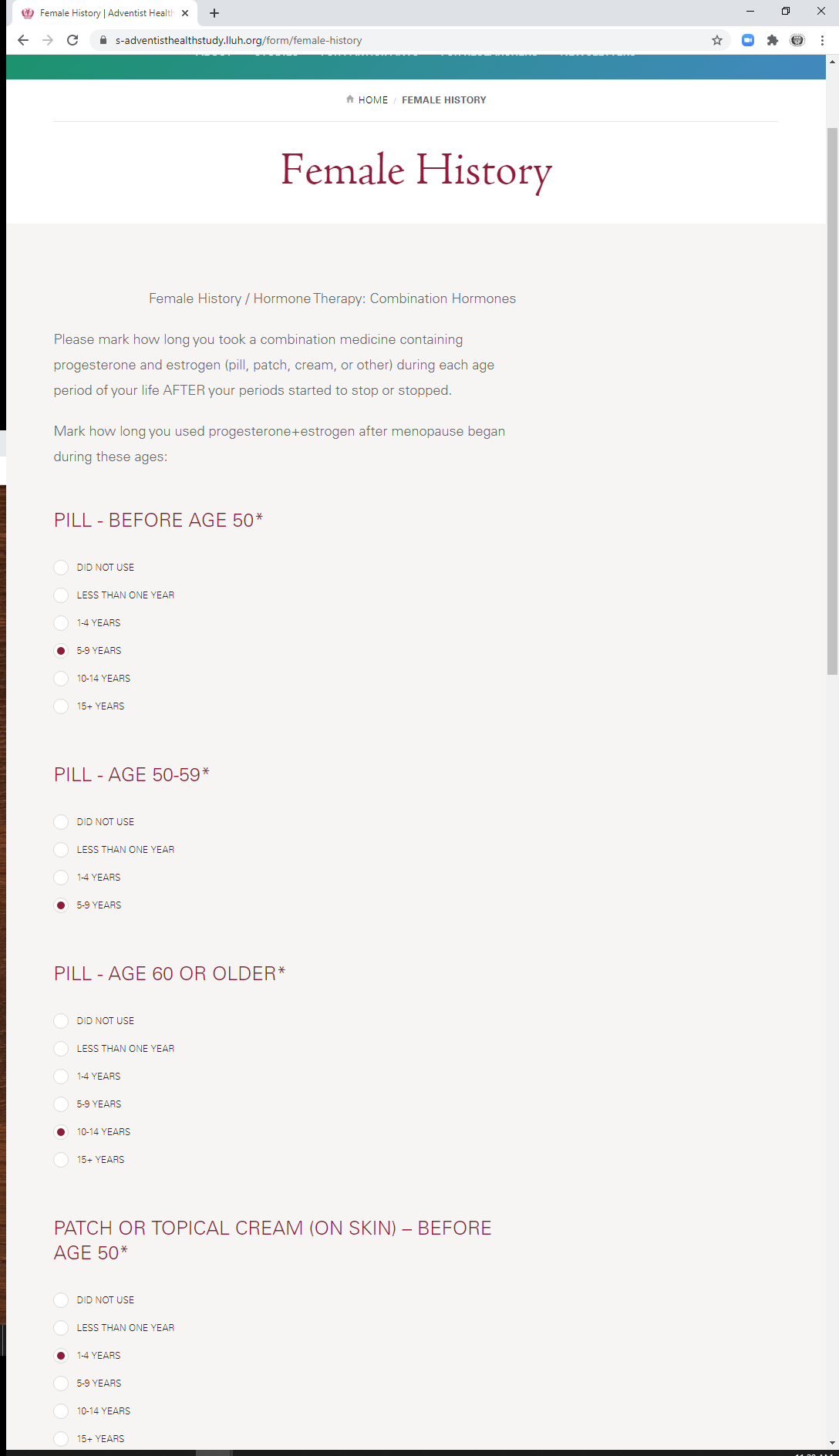 * During which ages did you take a combination hormone pill? (check all that apply)