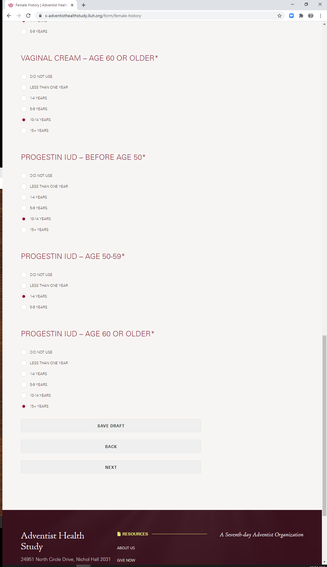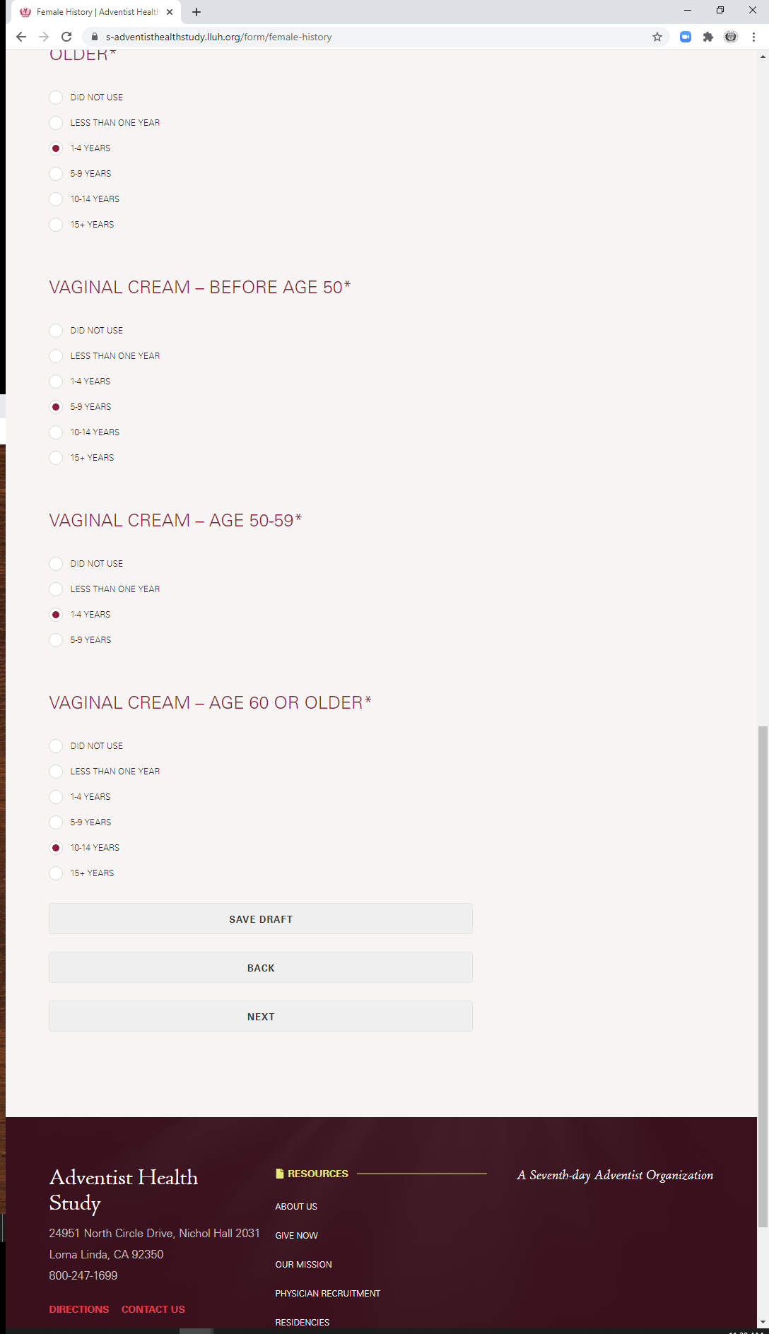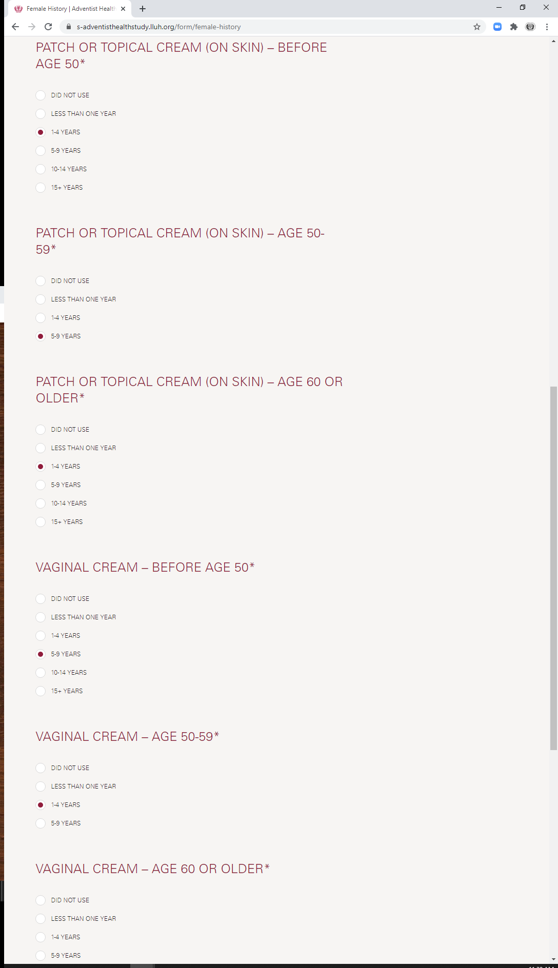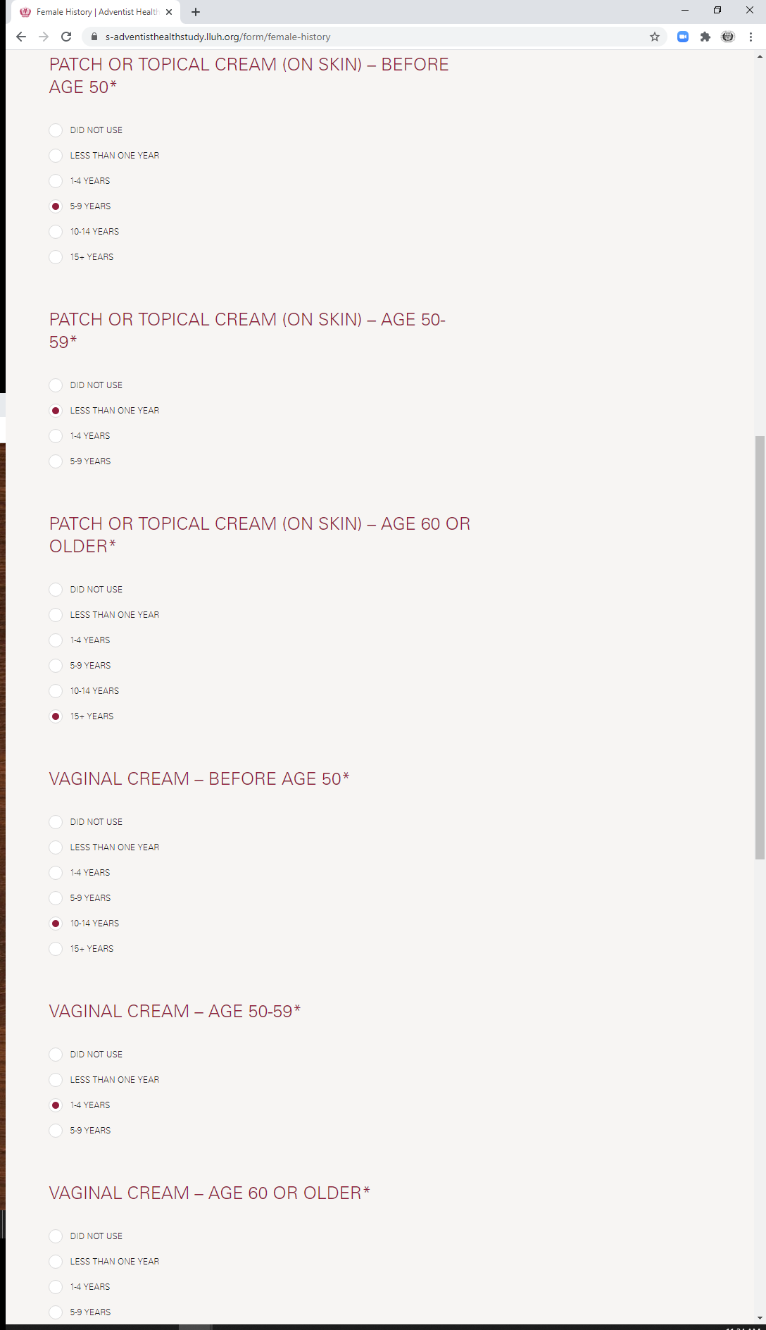 * During which ages did you take a combination hormone vaginal cream? (check all that apply)