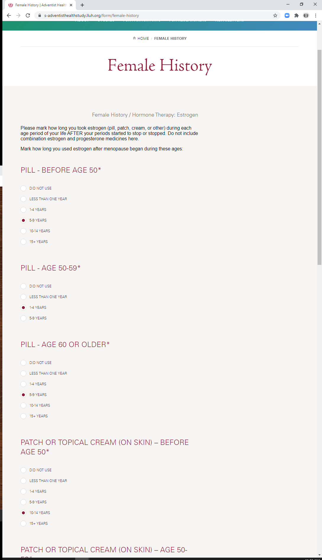 * During which ages did you take a combination hormone patch or topical cream (on skin)? (check all that apply)