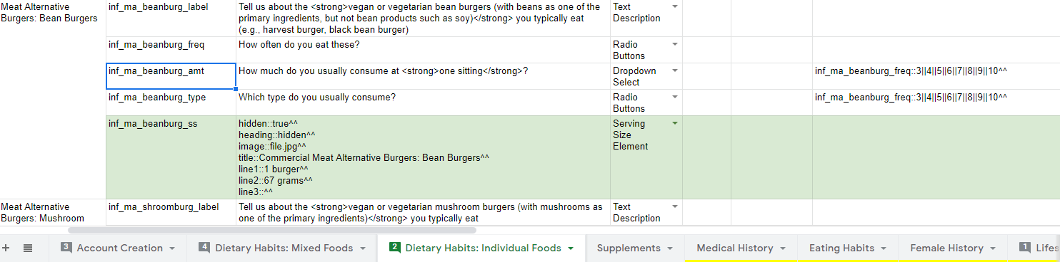 A Google spreadsheet is maintained for developing the online questionnaire. Access to this spreadsheet is granted upon request. This spreadsheet contains the the content, organization, and logic for the survey.
